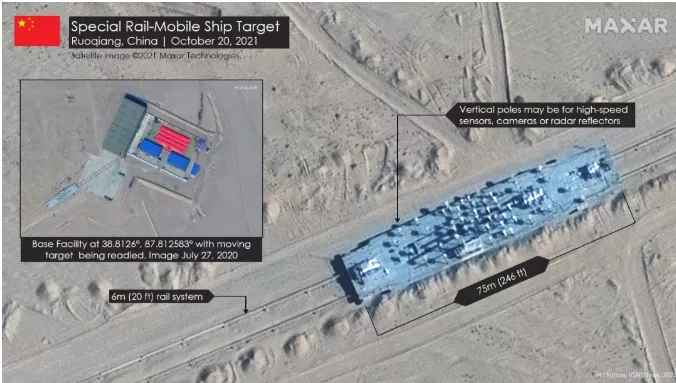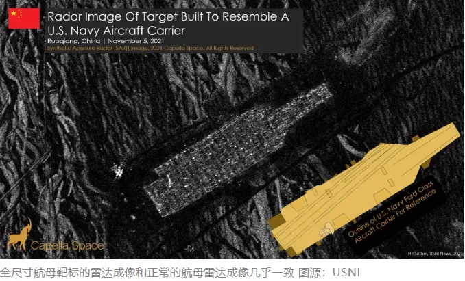 這一靶標的雷達成像效果幾乎和真實航母別無二致,同時還有各類可以模擬航母電磁和紅外信號的儀器,並可以幫助各類傳感器實現目標搜索和鎖定。此外,該靶場還有一艘全尺寸美國航母的輪廓靶標和至少兩艘伯克級驅逐艦的輪廓靶標,這些靶標上同樣配有相應儀器,它們顯然也都是解放軍反艦彈道導彈的訓練道具。