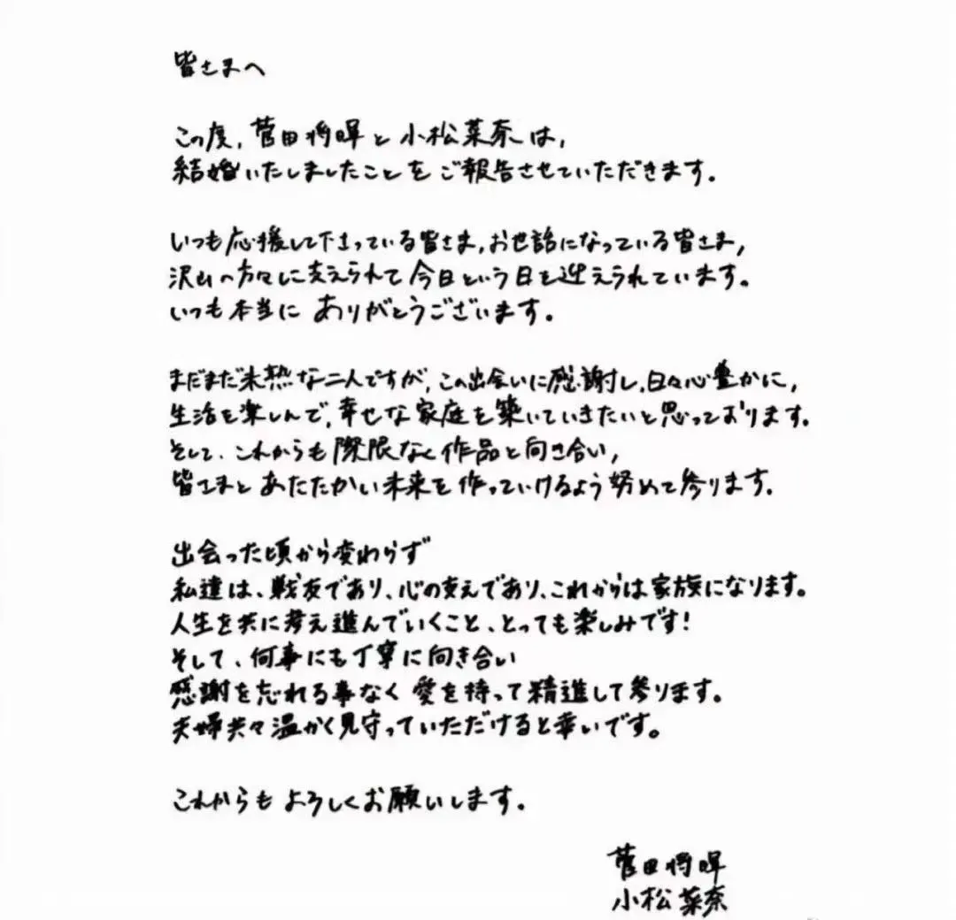 小松菜奈在手寫信中寫道,“我們從初識開始就一直沒變,是戰友,是彼此心靈的支柱,現在開始將成為家人。非常期待能夠一起走過人生。我們不會忘記感恩,會帶着愛繼續提升自己,希望大家繼續支持我們。”