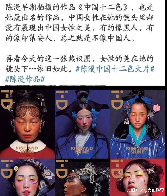 陳漫是被吹起來的,被高估太多了,自封的藝術家水平還遠遠不到,一個攝影人,比較會p圖,但是作品有好有壞,文中這些實在不敢恭維。給錢就醜化亞裔、也不知道陳漫自己知道不知道呢?