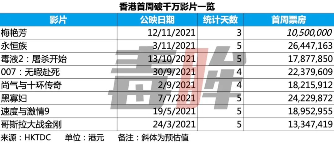 從單片的維度來看,《梅豔芳》的開畫表現尤為出色:從3月份的《哥斯拉大戰金剛》開始,今年首周票房破千萬港元的影片共有8部,除《梅豔芳》外清一色為好萊塢大製作。11月初《永恆族》以2645萬港元創下年度首映紀錄,《黑寡婦》(2423萬港元)和《007:無暇赴死》(2238萬港元)分列其後。