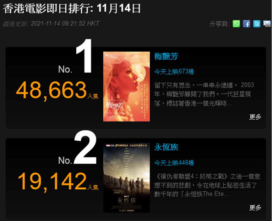 在即日排行榜上,公映首週末《梅豔芳》便無懸念登頂,並以逾1倍的優勢壓制漫威新作《永恆族》,後者剛於一周前登陸大銀幕。《梅豔芳》與其他好萊塢大片相比也毫不遜色:漫威亞裔超英電影《尚氣與十環傳奇》首日票房為318萬港元,在所有周四公映影片中名列前茅。雖然《梅豔芳》於週五亮相略佔優勢,但與《尚氣與十環傳奇》的單日差距不足10萬港元 ,顯示傳記片的票房潛力不容小覷。