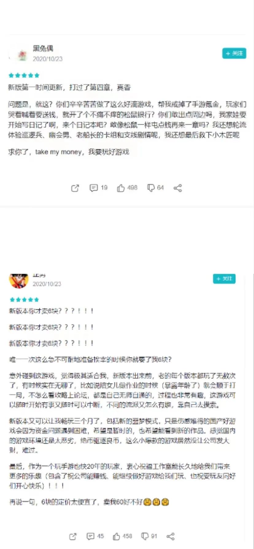 這個遊戲目前在Taptap評分高達9.6,不少玩家不但能接受持續的DLC付費,甚至還嫌DLC賣得太便宜,沒辦法給自己喜歡的遊戲更多一些支持。