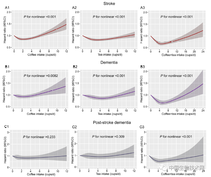 與那些既不喝咖啡也不喝茶的人相比:每天飲用2-3杯咖啡和2-3杯茶的人中風風險降低了32%,痴呆風險降低了28%;咖啡和茶的攝入量與缺血性中風和血管性痴呆的風險降低有關。此外,茶與咖啡的組飲用合與較低的中風後痴呆風險相關;每天飲用3-6杯咖啡和茶發生中風後痴呆的風險最低。