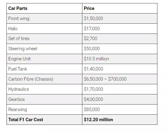 外媒估測的F1賽車整車價格(單位:英鎊)