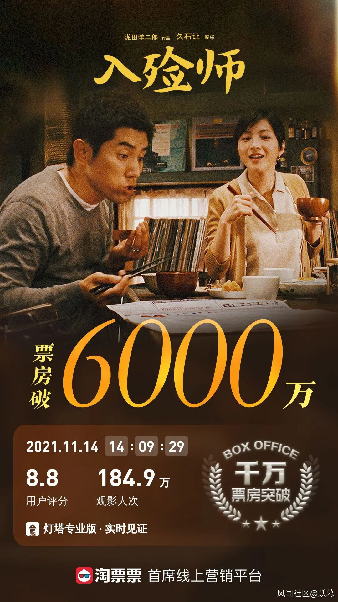 10月29日,與《007:無暇赴死》同天上映的《入殮師》目前累計票房已經超過6000萬。11月單月票房進入到了前五名。