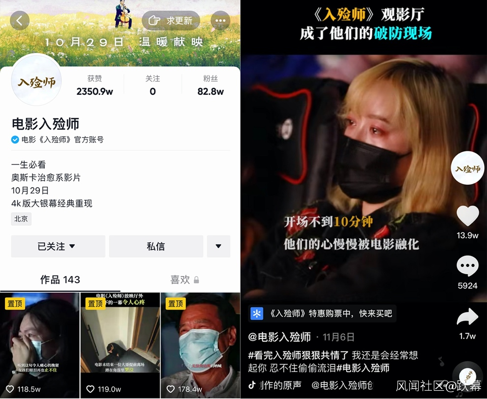 目前,電影《入殮師》官方抖音賬號粉絲量超80萬,獲贊超過了2300萬,抖音主話題播放量突破了9億。這也給電影帶來了持續的數據轉化,映前一週雙平台想看數據達到高峯,而短視頻的破圈也為電影通過上座率逆跌提供了基礎。