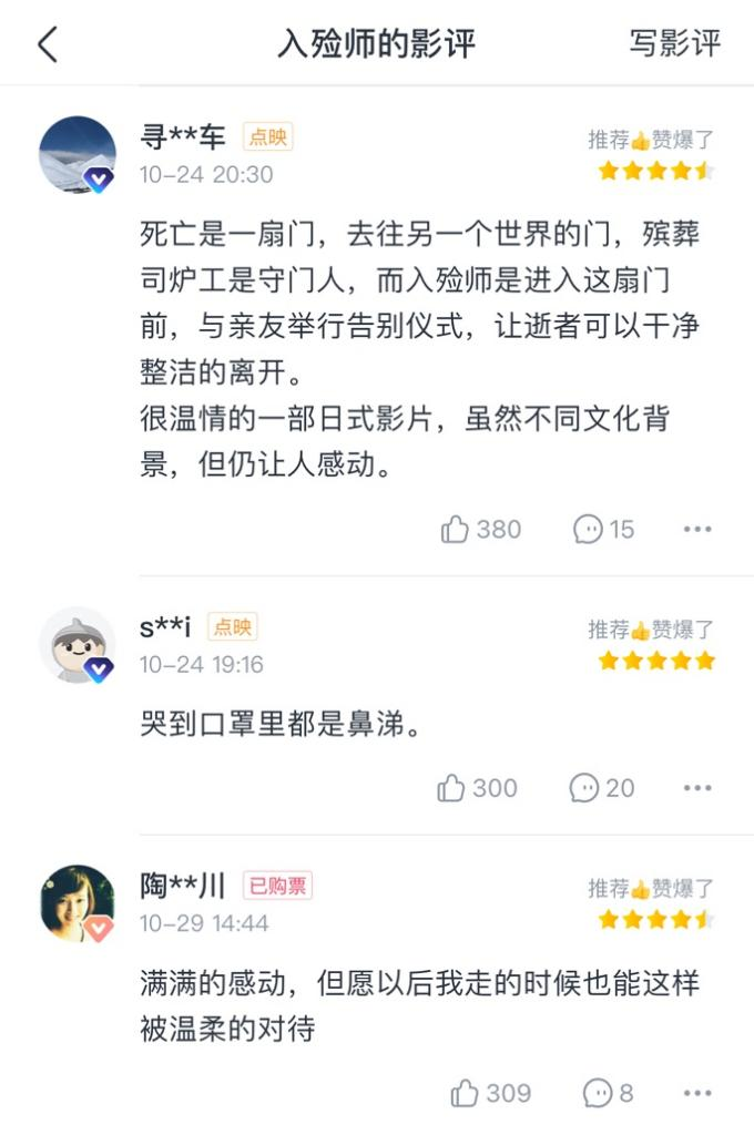 《入殮師》曾在第81屆奧斯卡金像獎中拿下最佳外語片,並且在豆瓣TOP250中排名第111位。在影迷羣體中,《入殮師》本身就有着很高的地位。但取得破6000萬的票房,更多的原因在於內容跨時代的吸引力在受眾羣體上的“破圈”。