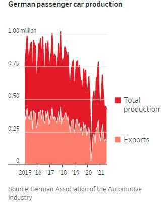 今年夏季德國汽車產量下降,是同期該國工業產出整體下滑的最大單一因素,主要原因是芯片持續短缺。自2017年以來,德國汽車產量已下降了50%以上,至每月約20萬輛。在截至今年9月的9個月中,德國輕型汽車產量較上年同期略有下降,而同期全球輕型汽車產量則同比增長了約10%。截止到2020年的五年裏,德國在全球汽車產量中所佔的份額已從7%下降到了5%。