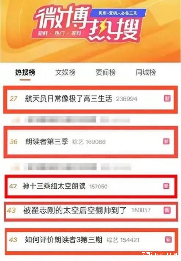 △翟志剛朗讀『激流』總序(節選)本期節目一經播出便引發熱議,微博端#神十三乘組太空朗讀#話題閲讀量3110.7萬次。此外,#如何評價朗讀者3第三期#、#被翟志剛的後空翻帥到了#、#朗讀者第三季#、#航天員日常像極了高三生活#等5個話題均登上熱搜榜,人民日報、共青團中央、光明日報等官方媒體均轉載宣推。