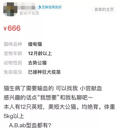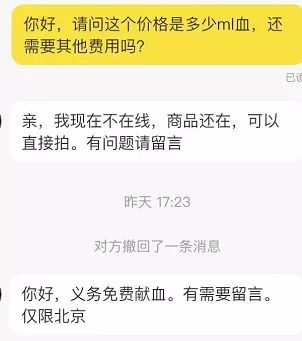 兩天以後得到了賣家的回覆,他表示義務免費獻血,僅限北京。然而留言區他又明碼標價表示貓血收費。