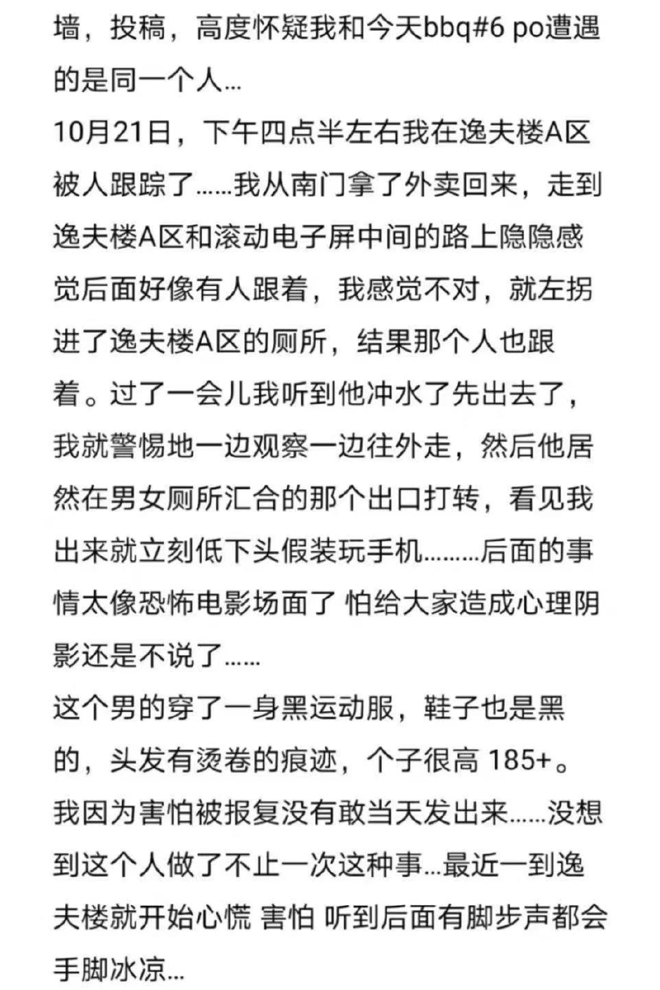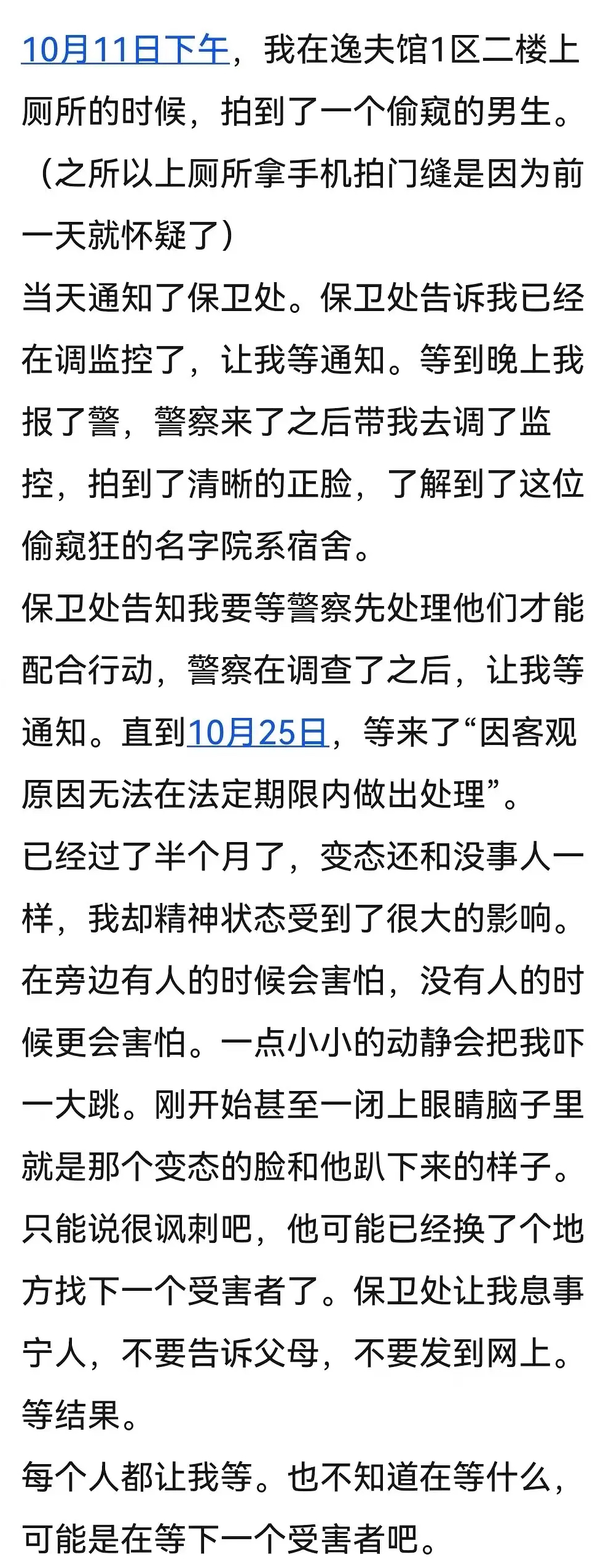 10月26日,受害人因為遲遲等不到一個説法,在校內表白牆發帖求助。