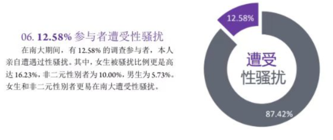 有12.58%的學生在校期間遭遇過性騷擾;有76.62%的學生曾聽聞校園性騷擾事件發生。