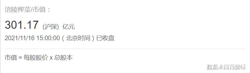 截至2021年11月16日收盤,涪陵榨菜報收33.93元/股,較今日35.63元的開盤價,已跌超4.2%,較之於今年2月19日的53.67元/股的高位,已跌超36%,目前總市值為301.17億元,相較於2020年9月3日55.80元/股的歷史高點,足足蒸發了近140億。