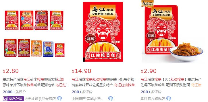 11月16日,我們隨機在電商平台進行檢索發現,涪陵榨菜出品的烏江榨菜,80g包裝版已經賣到近3元一袋的價格了,好傢伙,這比普通袋裝方便麪都貴,難怪很多網友驚呼不配吃榨菜了。