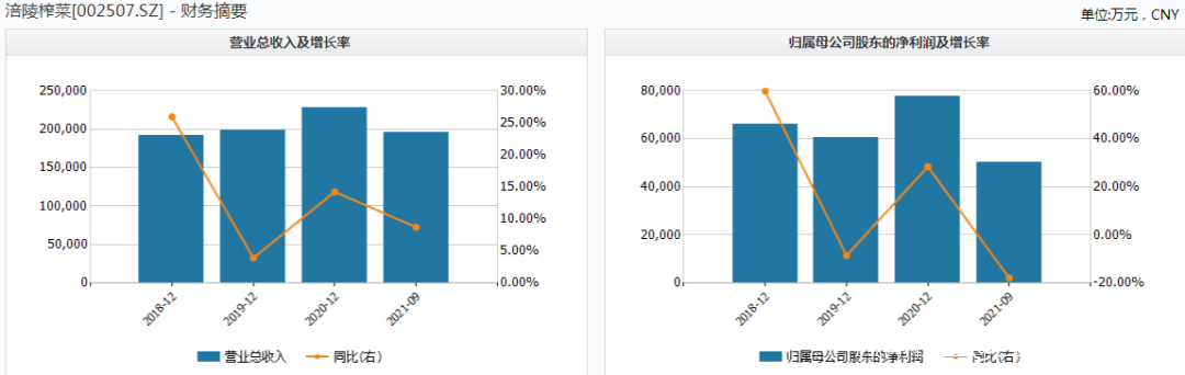 2021年Q3,涪陵榨菜實現營收6.09億元,同比增長1.03%,實現淨利潤1.27億元,同比下滑39.07%;