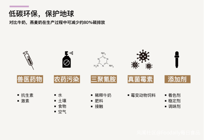 其次是乳品生產的可持續性,低碳環保的理念已開始在消費者心中紮根,對比牛奶生產中不可避免造成的碳排放,植物奶特別是對環境更友好的燕麥奶顯然具有得天獨厚的優勢。BBC在2015年曾對比過牛奶和燕麥奶碳足跡,數據顯示,生產燕麥奶的温室氣體排放量僅為生產牛奶的1/5,還能大幅度降低對水和土地資源的消耗,節約了大量資源。