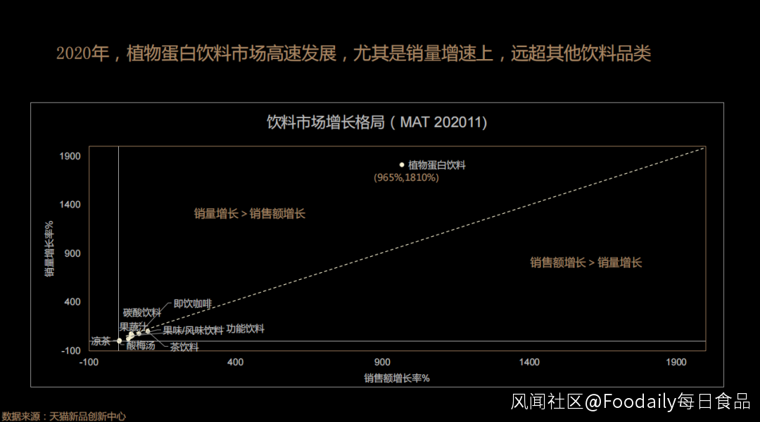 無論是乳糖不耐受人羣、彈性素食者,或是注重減脂和控糖的人羣,再或是樂於嘗試新事物和已經培養出植物奶飲用習慣的消費者,這一市場的消費和潛在消費羣體都越來越龐大;加上植物奶低熱量、低膽固醇、低脂等健康屬性符合國內越來越多人對健康食品的預期,植物奶的市場需求一直存在並有升高的勢頭。根據TMIC天貓新品創新中心數據,2020年植物蛋白飲料市場得到高速發展,銷量增速上更是遠超其他飲料品類。