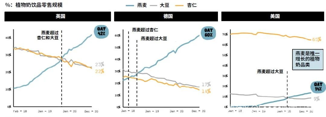 在眾多植物蛋白飲品中,燕麥奶地位強勢,目前已成為歐美市場的重要品類。以英國為例,根據IRI Infoscan數據,2020年英國燕麥奶零售額達到1.81億美元,同比增長98%,奠定了燕麥奶作為最大乳製品替代飲品的地位。