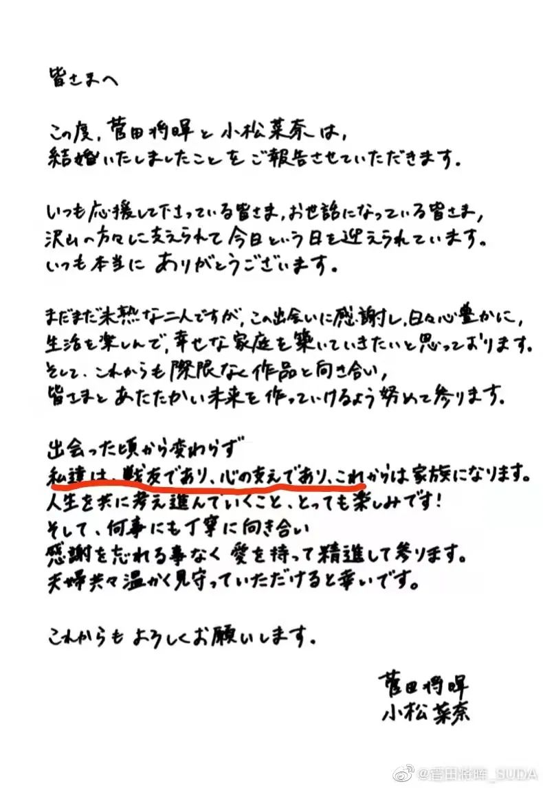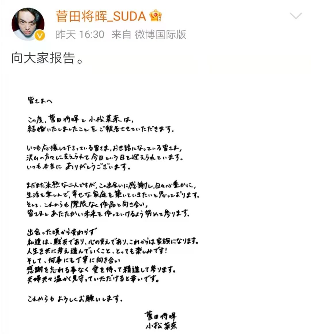 昨天下午,菅田將暉在微博上官宣了自己和小松菜奈結婚的消息。