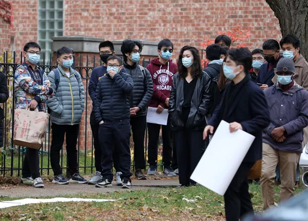 來自芝加哥大學的工作人員和學生在東54街1000號的臨時紀念場所前駐足,其中許多人手捧花束。他們在這裏紀念和哀悼年僅24歲的中國留學生鄭少雄。