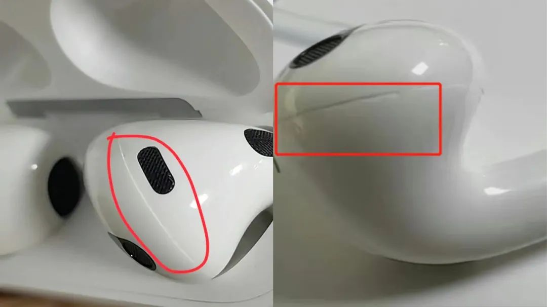 根據網友上傳的圖片可以看出,AirPods機身上有明顯的溢膠情況,一些耳機接縫處也的確存在接縫過大、有毛刺、不平整等情況。不僅耳機,接縫對不齊的情況同樣還出現在了一些AirPods的耳機殼上。