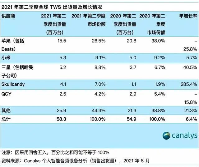 從最近的數據來看,儘管AirPods的出貨量有所下降,但AirPods系列的市場佔有率在TWS(真無線立體聲耳機)市場一直保持絕對領先地位。市場諮詢機構canalys的數據顯示,2021年第二季度,受到出貨量下降的影響,蘋果AirPods的TWS市場份額跌至30%以下。儘管如此,AirPods TWS的出貨量還是達到了1550萬台,而位居第二的小米,今年二季度的出貨量僅有530萬台。