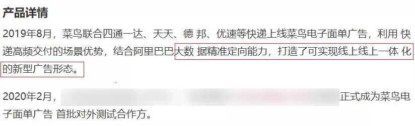 很有趣的是,在某個企業的面單廣告宣傳頁裏,他們還提到電子面單廣告會結合大數據精準定向能力,是一種新型廣告形態。