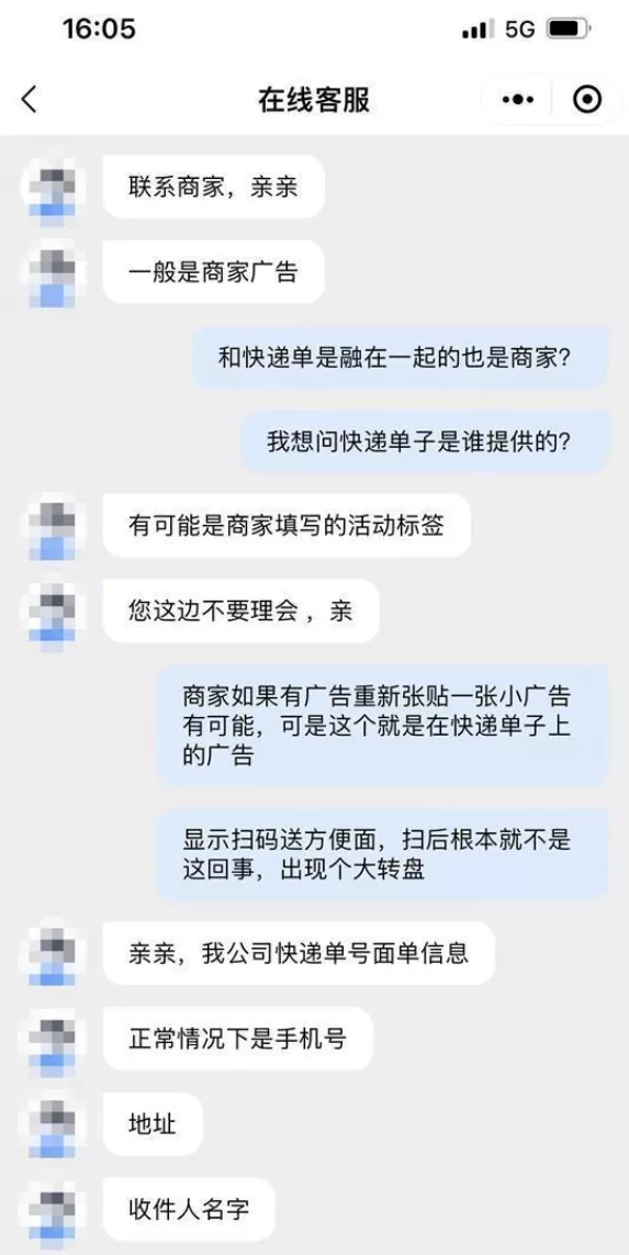 根據報道的截圖,當時快遞公司的客服把矛頭指向了商家,説一般是商家廣告。