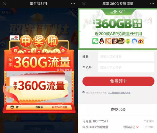 比如我在第一個福袋中,中了 360G 流量,但點進去發現,其實就是讓我花錢申領某王卡,享受內含 360G 專屬流量的卡內套餐。
