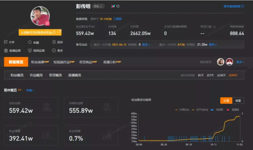 被稱為能與李子柒一較高下的手藝人“彭傳明”,則在過去3個月內漲粉幅度近200%,粉絲數總計達611w,許多網友都表示對他下一步的商業化轉變十分期待。