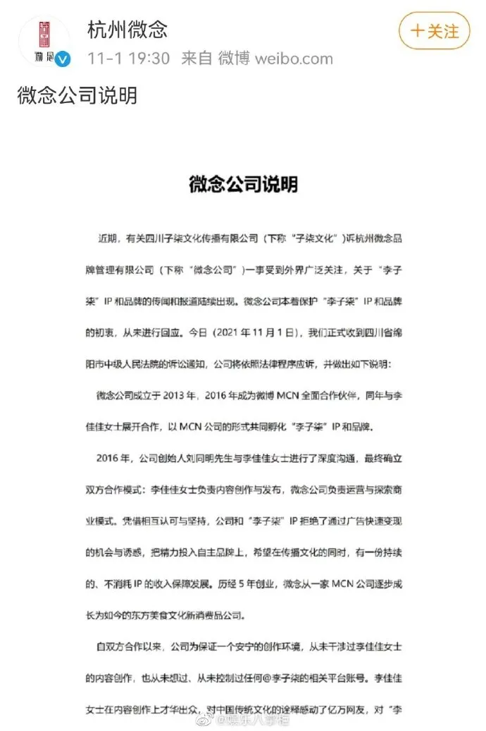 △微念公司的回應發佈不到一小時,李子柒的助理迅速在微博上怒懟