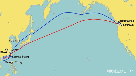 亞洲到北美西海岸的跨太平洋航線主要是兩條,一條是美西南航線,即由中國沿海港口出發到洛杉磯和長灘港;另一條是美西北航線,即由中國沿海港口出發到加拿大温哥華和美國西雅圖。其中温哥華港是主要掛靠港,也是加拿大最大的港口。加拿大的進口海運集裝箱貨物主要在温哥華卸貨之後轉鐵路運抵加拿大內陸地區。加拿大的農產品也主要通過温哥華港出口。