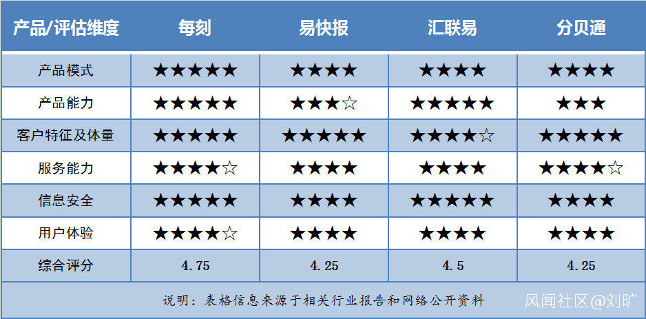 市場前景大,但是初階段下所有玩家其實都在摸索切入點和可行的模式,五六年前進場的第一批玩家中,已經有幾家在資本的助力下慢慢上了道,有了一定的規模和較為完善的產品體系。所以目前智能財務賽道已經走出了早期的競爭格局,靠前的幾家幾乎並駕齊驅,包括匯聯易、分貝通、每刻、易快報,但是從定位、產品模式、用户特徵和規模體量來看,它們其實各有長處。