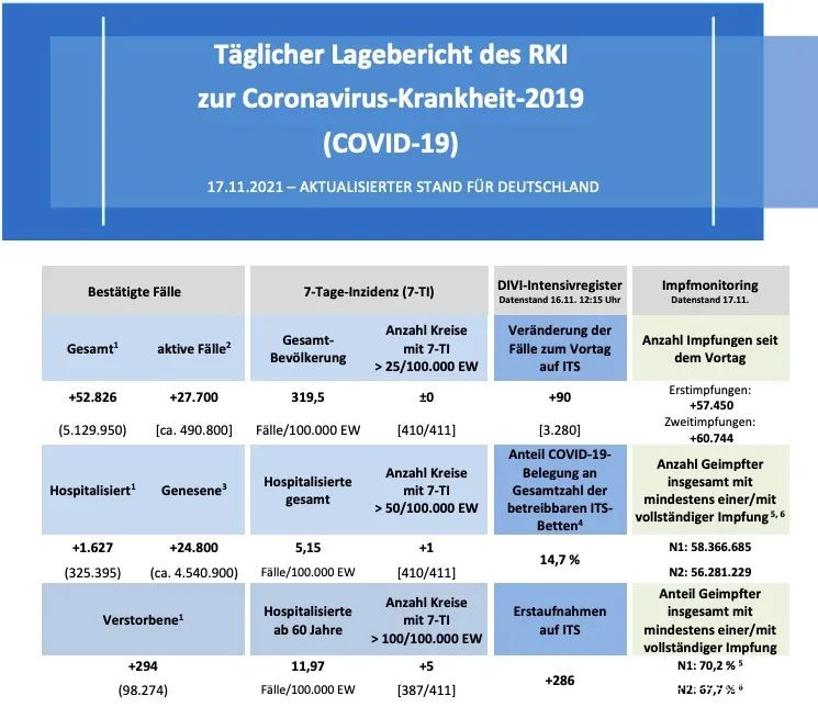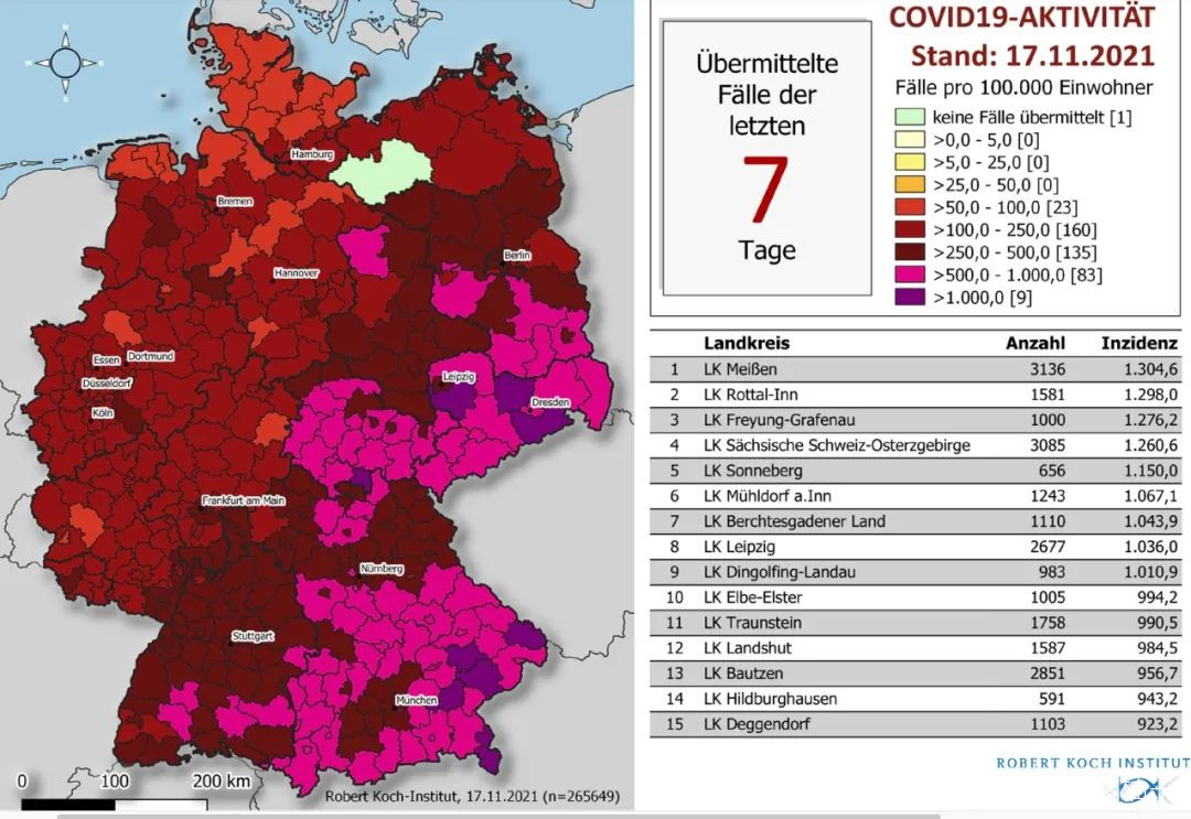 根據德國聯邦疾控機構羅伯特·科赫研究所最新數據,截止到11月17日0時,德國新增新冠病毒感染者52826例,累計確診5129950例,新增死亡病例294例,因感染新冠病毒死亡人數總計98274例。
