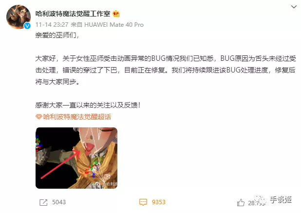 14號晚間,微博號“哈利波特魔法覺醒工作室”發聲明表示,女性無視受擊動畫異常屬於bug,原因是舌頭沒有經過受擊處理,所以錯誤地穿過了下巴,造成了這樣的情況,正在修復。