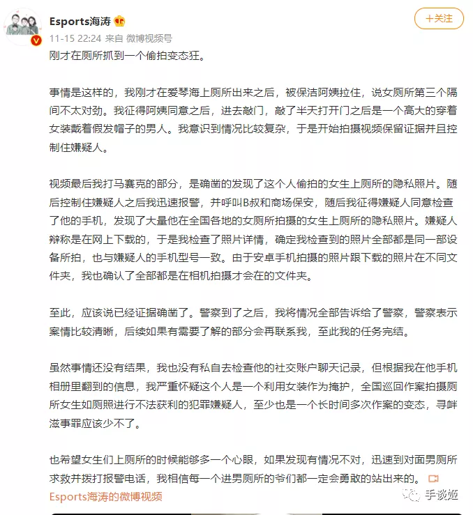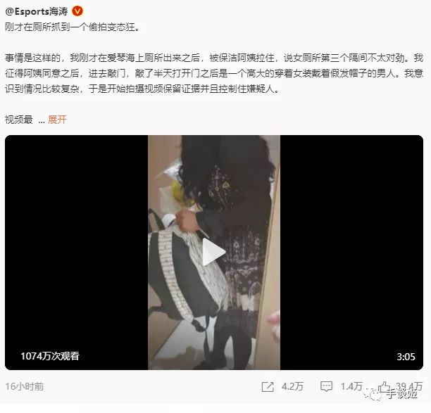 而在昨晚,Esports海濤發微博表示,自己在廁所捉住了一個變態偷拍狂,引起了網友的強烈稱讚。