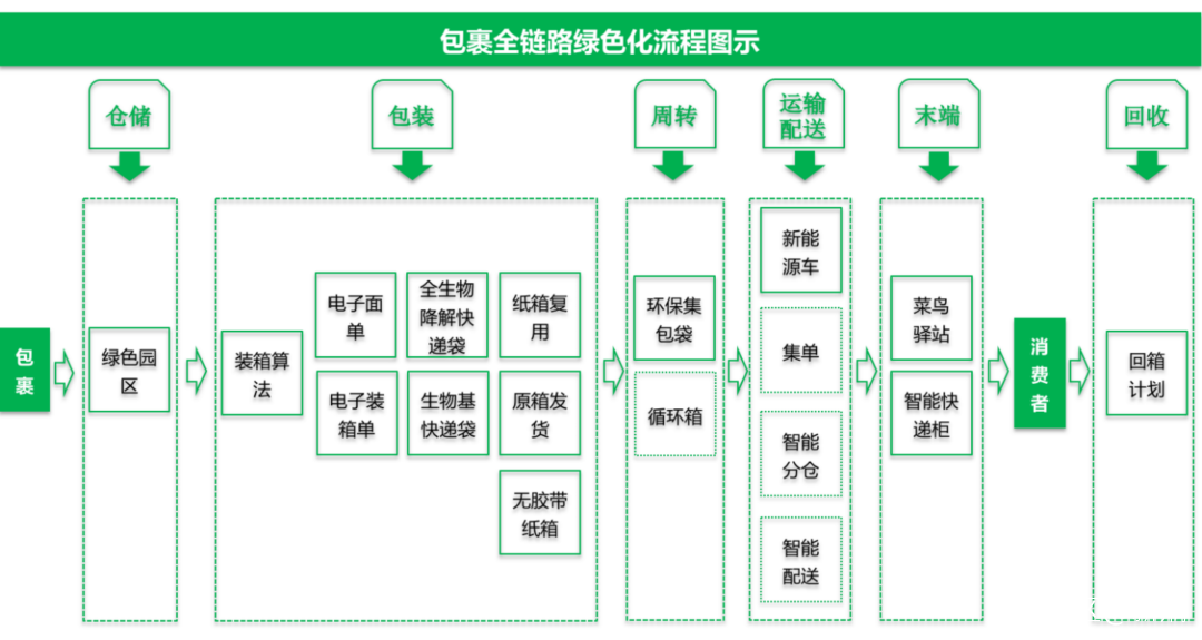 作為“綠色物流”的基礎設施重要推動者,踐行創新綠色環保行動的菜鳥,從包裝、配送、路徑規劃、回收,用倉庫到消費者打造一套完整的綠色包裹、綠色運輸、綠色回收的解決方案,使可持續的理念一步步走向大眾生活。