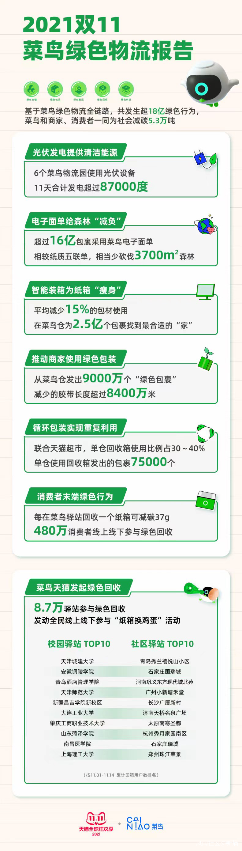 2017年起,菜鳥聯合各快遞公司啓動“回箱計劃”:在快遞網點鋪設綠色回收箱,推動分類回收、循環利用的消費者習慣。截至目前菜鳥綠色回收箱已經覆蓋全國31個省區市300多個城市,今年雙11,菜鳥聯合天貓在末端再新增約1.3萬個回收箱。