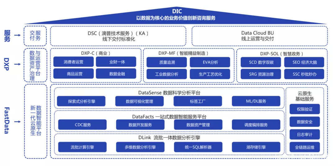 簡單來説,DIC是給客户提供全面的業務創新諮詢和解決方案設計。這也是滴普產品服務體系的特殊之處。滴普科技考慮到客户數字化的整體數據價值,從頂層數據戰略規劃入手,集結了DIC部門內多個行業領域專家,基於對業務的深厚理解,為客户提供專業的解決方案設計,並梳理業務標籤,從而形成指標,再通過大數據、數據建模等數據智能技術,沉澱數據資產,賦能業務決策。