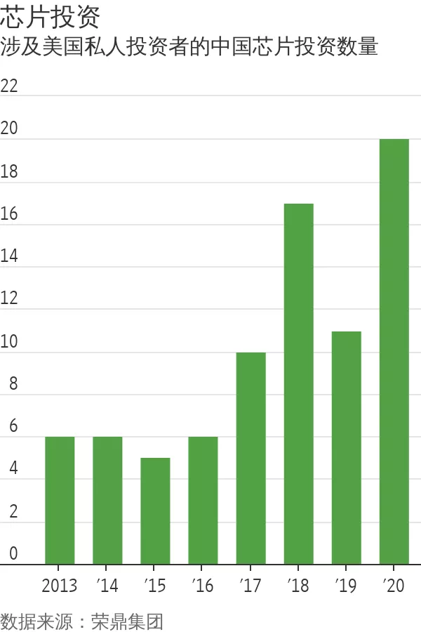 根據紐約研究公司榮鼎集團(Rhodium Group)對交易數據進行的分析,從2017年到2020年,美國風投公司、芯片行業巨頭和其他私人投資者參與了中國半導體行業的58項投資交易,比此前四年的數量多出一倍以上。