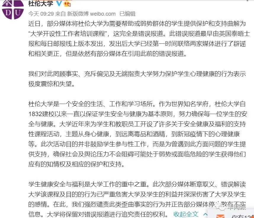 聲明與英文版略有不同,聲明表示:“近日,部分媒體將杜倫大學為需要幫助或弱勢羣體的學生提供保護和支持曲解為‘大學開設性工作者培訓課程’,這完全是錯誤報道。此錯誤報道最早由英國《泰晤士報》和《每日郵報》線上版本發出,發出後大學已經第一時間聯絡兩家媒體進行了闢謠和相關更正,但是依然有部分媒體在引用此前的錯誤報道。我們對此罔顧事實、充斥偏見及無端指責大學努力保護學生心理健康的行為表示極度震驚和失望。”