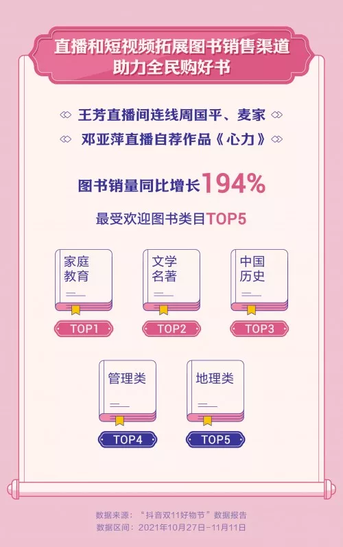 隨着互聯網發展,電商賣書早已是大勢所趨。如今,抖音電商的短視頻和直播賣書形式,也正在成為圖書銷售的新渠道。剛剛過去的“雙11”,抖音電商的圖書銷售也創下佳績。11月12日,“抖音雙11好物節”數據報告發布,“雙11”期間,抖音電商圖書銷量同比增長了194%。鄧亞萍通過抖音直播向讀者介紹了其首部圖書作品《心力》,達人王芳在直播間與作家周國平、麥家連麥,為讀者推薦了上百款優質圖書。