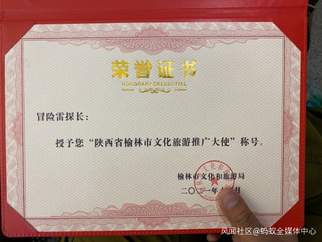 11月16日晚,網紅博主“冒險雷探長”發佈微博稱,他當天被陝西省榆林市文旅局授予“文化和旅遊推廣大使”稱號。其配發的照片顯示,榆林市文旅局局長常少海與其進行座談並頒授榮譽證書。