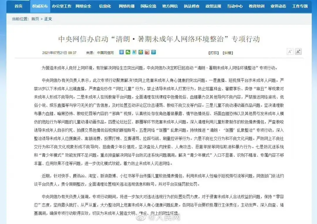 今年7月21日,中央網信辦也起啓動清朗暑期未成年人網絡環境整治專項行動,嚴禁16歲以下未成年人出鏡直播,有關負責人表示,此次專項行動聚焦解決7類網上危害未成年人身心健康的突出問題:
