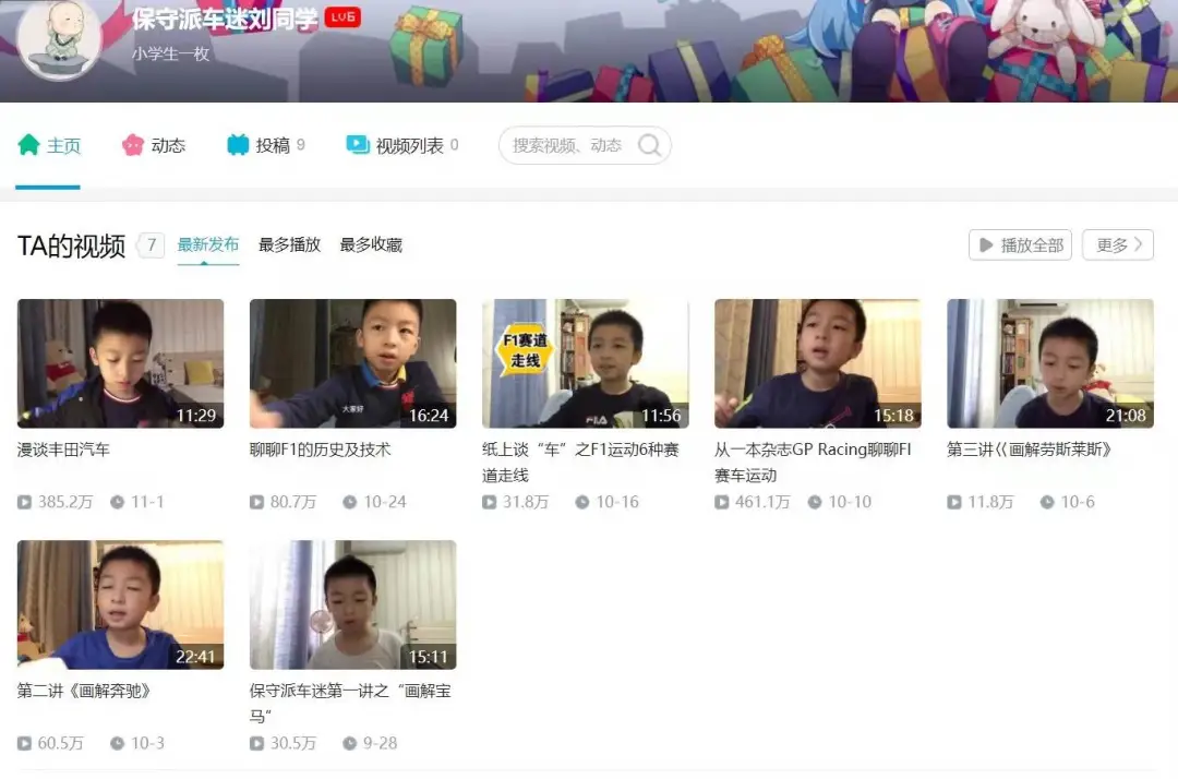 他們在彈幕裏大呼“保守派車迷劉同學”為“教授”,憑藉着這種跟真實年齡的反差萌,“保守派車迷劉同學”在9月28日的第一期視頻就斬獲了35萬播放量。10月10日的F1賽車運動播放量甚至超過了400萬。最新一期就是老胡看的《漫談豐田汽車》,目前播放量已經高達556萬,目前“保守派車迷劉同學”粉絲數量也逼近三十萬。
