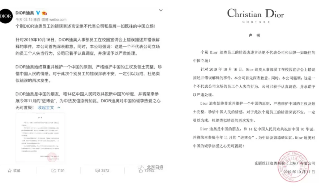 再往回看,這不是迪奧第一次與中國“為敵”,早在2019年時,迪奧品牌在一場校園宣講會上展示中國門店地圖缺少中國台灣地區,有學生提出質疑,當時的工作人員先是回應:“可能是因為圖片太小,台灣太小,沒有顯示在上面,但其實是有的。”