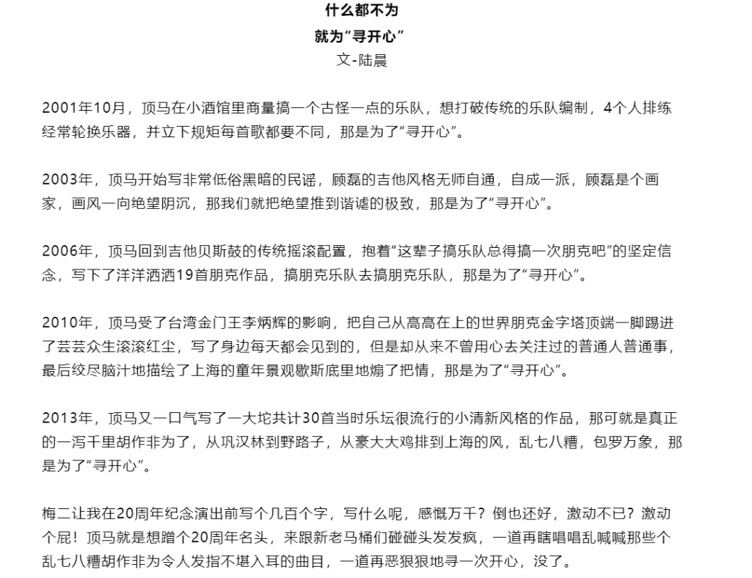 陸晨在給頂馬二十週年紀念演出的文章中寫道: