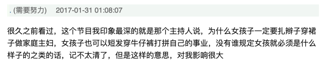 節目播出之後,有人評價她:「像是文學中走出來的人,這個人也非得是女人才可以。」