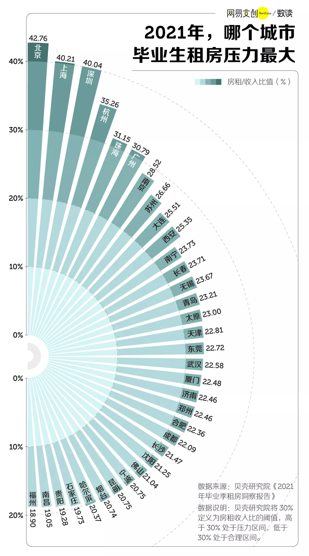 由網易數讀整理出來的城市房租收入佔比表格,據説明來看,基本北上廣深等大城市的租房壓力最大