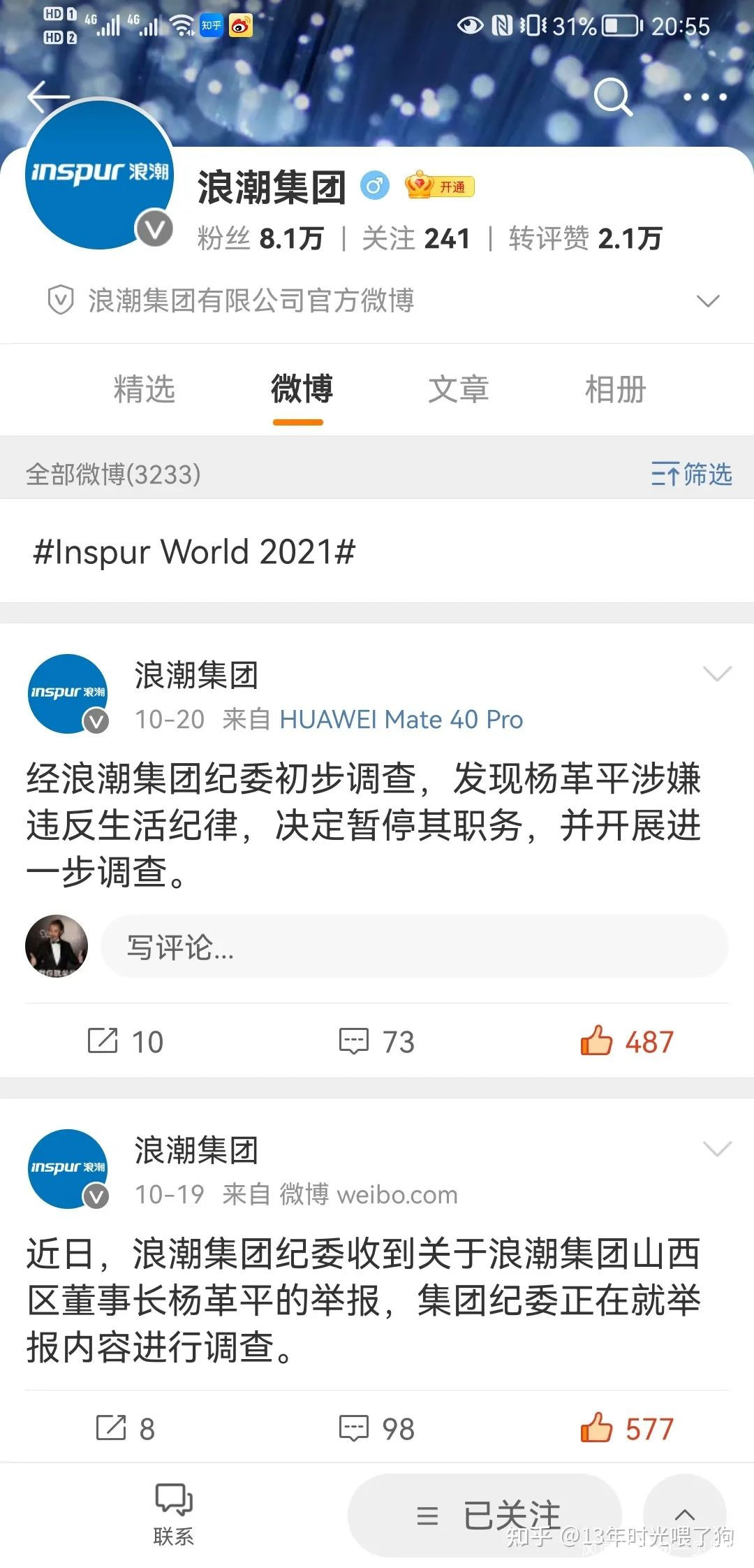 同日,@浪潮集團 發佈微博稱,收到關於浪潮集團山西區董事長楊革平的舉報,集團紀委正在就舉報內容正在調查。